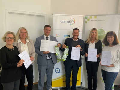 Bild der Kooperationsunterzeichnung v.l.n.r. Christine Wehausen (Staatliches Schulamt Göppingen),Karin Lehle (Bodelschwingh-Schule Geislingen),Jochen Heinz (Landratsamt Göppingen),Ignazio Ceffalia (Stadt Geislingen),Andrea Feyler (Grundschule Eybach) und Anka Männer (Staatliches Schulamt Göppingen)