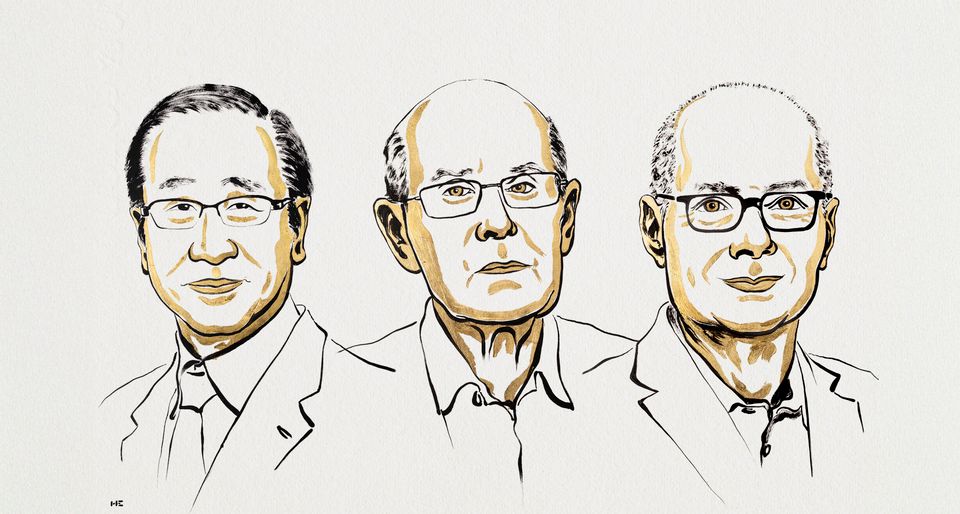 Illustration der diesjährigen Nobelpreisträger Susumu Kitagawa,Richard Robson und Omar Yaghi (von links nach rechts): Die Auszeichnung ist mit umgerechnet rund einer Million Euro dotiert