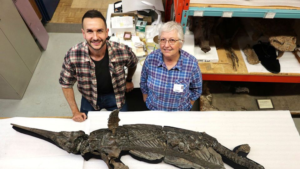 Paläontologen Dean Lomax (links) und Judy Massare mit Skelett eines Xiphodracon goldencapensis