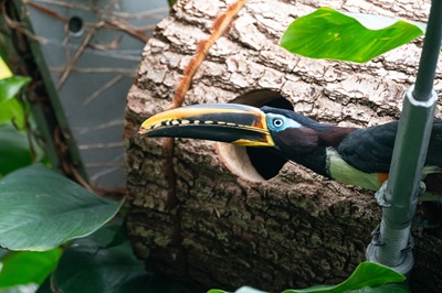 Foto (Wilhelma Stuttgart/Birger Meierjohann): Ein Elternteil der Braunohrarassaris mit Futter vor seinem Nistkasten.