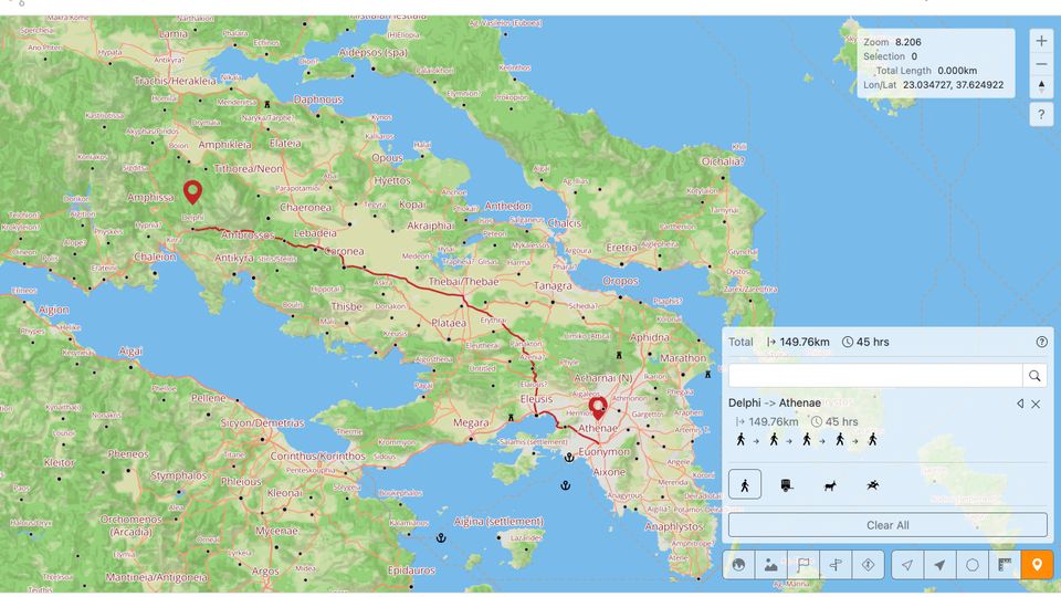 Screenshot des Routentools auf der Seite itiner-e.org: Von Delphi nach Athen in nur 45 Stunden