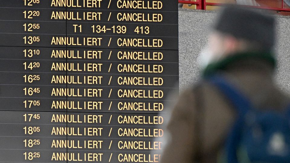 Eine Anzeigetafel voll mit annullierten Flügen (Symbolbild)