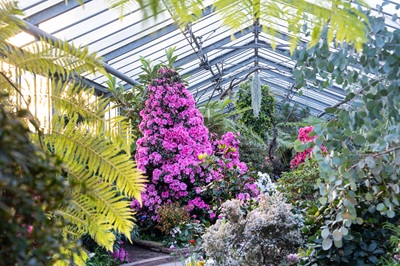 Bereits seit Ende Januar sorgen Kamelien im benachbarten Gewächshaus für ein aufsehenerregendes Farbspiel,nun stehen die ersten Azaleen in voller Blüte. Die Pflanzen sind kunstvoll arrangiert – als üppige Büsche,Hochstamm-Bäumchen oder in Pyramidenform geschnitten. Besonders imposant sind die bis zu zwei Meter hohen Azaleenpyramiden,deren Pflege viel Erfahrung erfordert. „Nach den sonnigen Tagen seit der letzten Februarwoche haben die Azaleen richtig Gas gegeben. Einige frühe Sorten stehen schon in voller Blüte. Aufgrund unserer Sortenvielfalt werden wir aber auch noch die kommenden Wochen viel Freude an der Azaleenblüte haben“,erklärt Gärtnermeister Marcus Hoffmann.