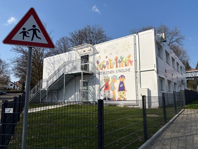 In insgesamt acht Monaten Bauzeit ist in dem Containeranbau nun Platz für zwei Gruppen entstanden. Eine Kita-Gruppe ist aus dem benachbarten Schulhaus in den Erweiterungsbau umgezogen. Eine zweite,zusätzliche Gruppe mit bis zu 25 Plätzen ist nun neu entstanden. Somit sind zwei Gruppen im Haupthaus und zwei Gruppen im zweistöckigen Erweiterungsbau untergebracht.
