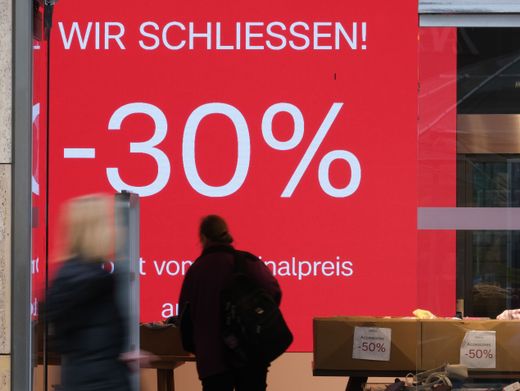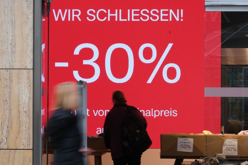 Transparent mit der Aufschrift »Wir schließen – 30 Prozent« im Eingang eines Modeladens in Stuttgart