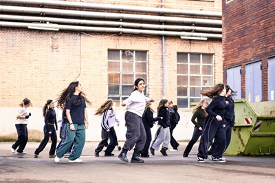 Foto (Nicole Fock): Bei der Probe zum Tanz-Land-Fluss-Festival im Boehringer-Areal haben die jungen Tänzer viel Spaß.