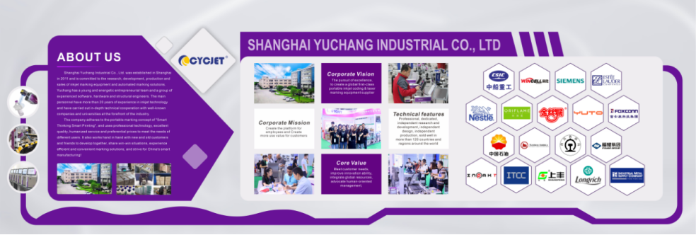 CYCJET ist ein erfahrener Hersteller, der sich seit über 20 Jahren der Forschung und Entwicklung in der Codier- und Markierungsbranche widmet. Das Unternehmen ist spezialisiert auf hochauflösende Tintenstrahldrucker, CIJ-Tintenstrahldrucker, Hand-Tintenstrahldrucker, Lasermarkierungssysteme und automatisierte Codiergeräte. Mit Sitz in Shanghai, China, ist CYCJET bestrebt, Herstellern weltweit zuverlässige und hochpräzise Markierungs- und Codierlösungen zu liefern.
