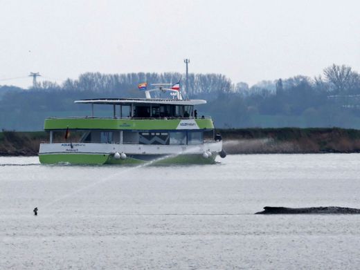 Ein Fahrgastschiff fährt in Sichtweite des gestrandeten Buckelwals vorbei